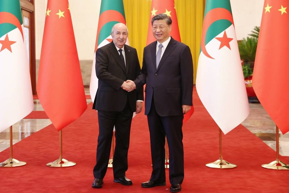 ففي يوم الاثنين الواقع فيه 17 تموز يوليو 2023 بدأ الرئيس الجزائري عبد المجيد تبون زيارة الى بكين استمرت خمسة أيام وكان عنوانها الأبرز هو تعزيز العلاقات الثنائية والشراكة لاستراتيجية بين لبلدين التي كانت قد اطلقت في العام 2014 وأردفت بخطة تعاون استراتيجي أعلنت في العام 2022 وتمتد حتى العام 2026. وقد اتفق الرئيس تبون والرئيس الصيني شي جينبينغ على تعزيز التعاون بين بلديهما في المجالات الاقتصادية والأمنية والعسكرية والتكنولوجية والزراعية والصناعية والتجارية، إضافة الى التعاون في مجلات الفضء والبنى التحتية والبتروكيماويات والطاقة المتجددة وتطوير السكك الحديدية والرياضة والاستثمار والتعاون التجاري والبحث العلمي والقضاء والتنمية الاجتماعية، ووقعا 19 اتفاقا في هذه المجالات. كما اتفق الرئيسان الجزائري والصيني على دعم المصالح الاستراتيجية المشتركة المرتبطة بالامن القومي للبلدين بما يحفظ سيادتهما وسلامة اراضيهما وفقا لما أعلنته وزارة الخارجية الصينية.
