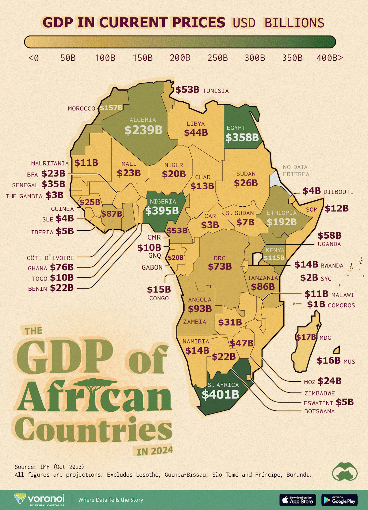 وقد أتت نيجيريا في المركز الثاني بعد جنوب أفريقيا مباشرة، حيث قدر ناتجها المحلي في عام 2024 بنحو 395 مليار دولار. وقد أدى انخفاض إنتاج النفط – وهو الصادرات الرئيسية للبلاد – إلى جانب مشاكل النقد الأجنبي، إلى أزمة اقتصادية أوسع نطاقا، مما أثار احتجاجات واسعة في البلاد. ويتفشى التضخم أيضًا في الاقتصاد أيضًا: ومن المتوقع أن يصل إلى ذروته عند 33٪ بحلول منتصف عام 2024.