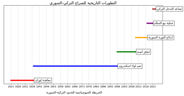 عندما ظهرت تركيا الحديثة كانت القضايا العالقة مرتبطة بتوزيع القوة في غرب آسيا عموما، وكانت معاهدة سيفر (1920) وبعدها اتفاقية سان ريمون من نفس العام مجرد إدارة لأزمات متفاقمة تم حسمها بعيدا عن النخب السورية عبر ترسيم الحدود بين تركيا وسوريا من خلال اتفاق أنقرة (1921)الذي أبرمته تركيا مع فرنسا المنتدبة على سوريا، بينما بقي ملف لواء إسكندرون (هاتاي) مصدرا للنزاع، حيث قامت تركيا بضم المنطقة عام 1939 بعد استفتاء مثير للجدل، اعتبرته سوريا غير شرعي، وظل مطلب استعادته جزءا من الخطاب الوطني السوري لعقود.