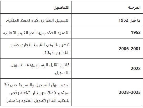 منذ العام 1952، استُحدث نظام التمديد الحكمي (حسب المرسوم 111)، الذي حرّم على المؤجّر إنهاء العقد أو زيادة الأجرة بحرية، وأفقده القدرة على التصرف في ملكه، جاء بعد ذلك توازن محدود في 2001 (قانون 6) عندما سُمح للمالك بطلب الإخلاء مقابل تعويض بنسبة 40%، لكنه لم يشمل سوى بعض العقارات )، ثم تتالت التعديلات،10/2006 و32/2010 و20/2015، حيث حاولت تلك الإجراءات إدخال حرية التعاقد جزئيا وتقليص الملكية غير القابلة للتصرف، لكن “الفروغ” والتطبيق القضائي بقيا عقبة رئيسية.