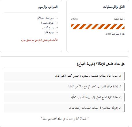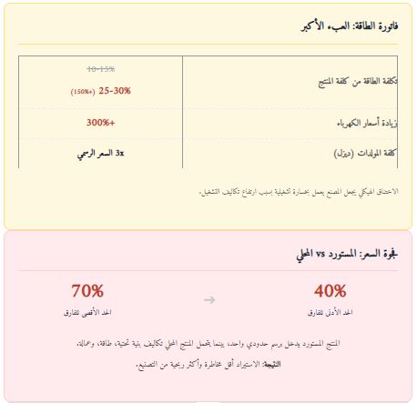 تكلفة الطاقة تشكل بين 25 إلى 30% من كلفة المنتج الصناعي، مقارنة بـ10–15% في اقتصادات صناعية نامية.